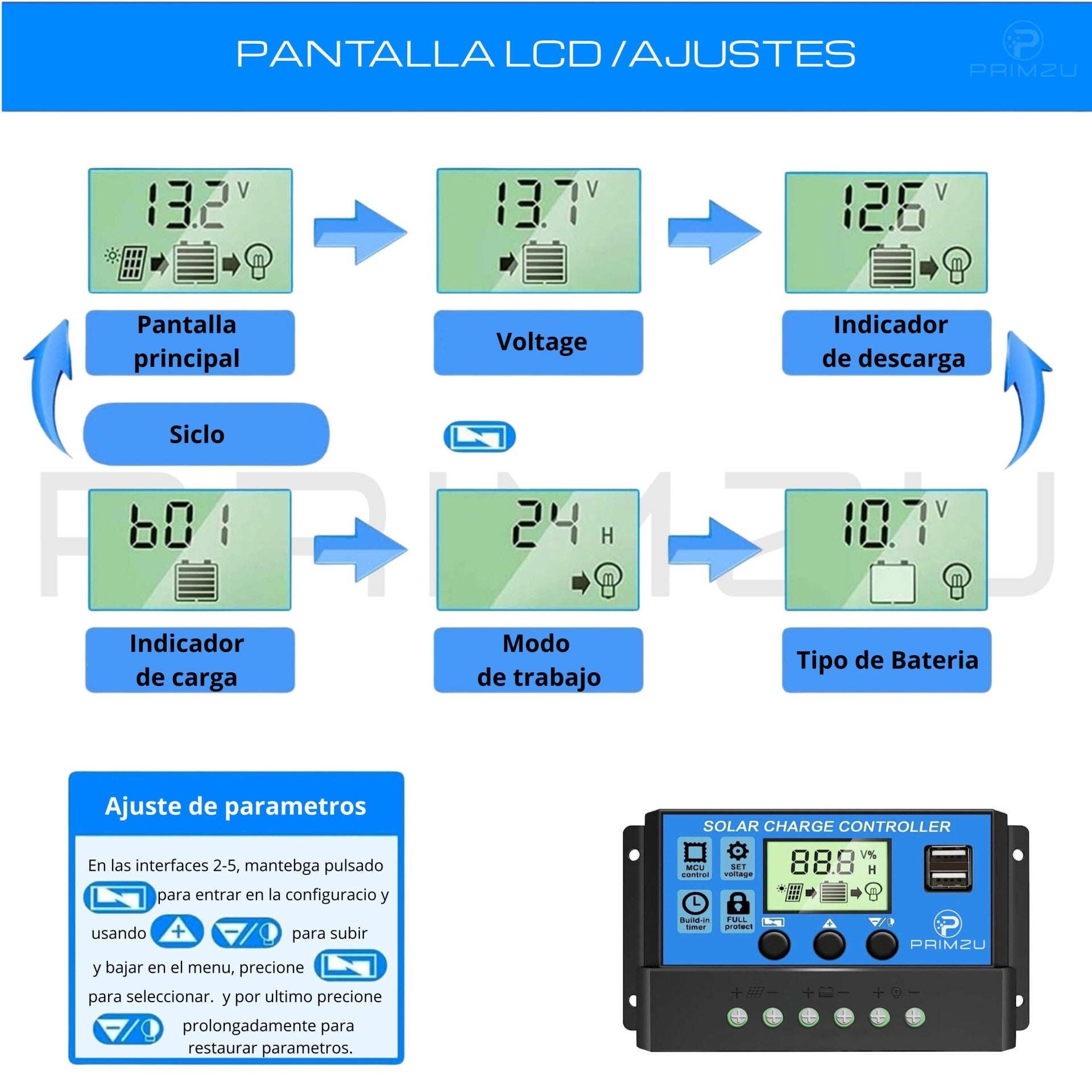FÁCIL DE LECTURA Y AJUSTABLE: El estado y los datos se leen fácilmente gracias a su pantalla LCD. Además, permite cambiar de modo y configurar parámetros como el ajuste de la tensión de flotación, reconexión y detención de descarga de la batería. Esto protege la batería contra sobredescargas. Es adecuado para uso doméstico, industrial, comercial, etc.